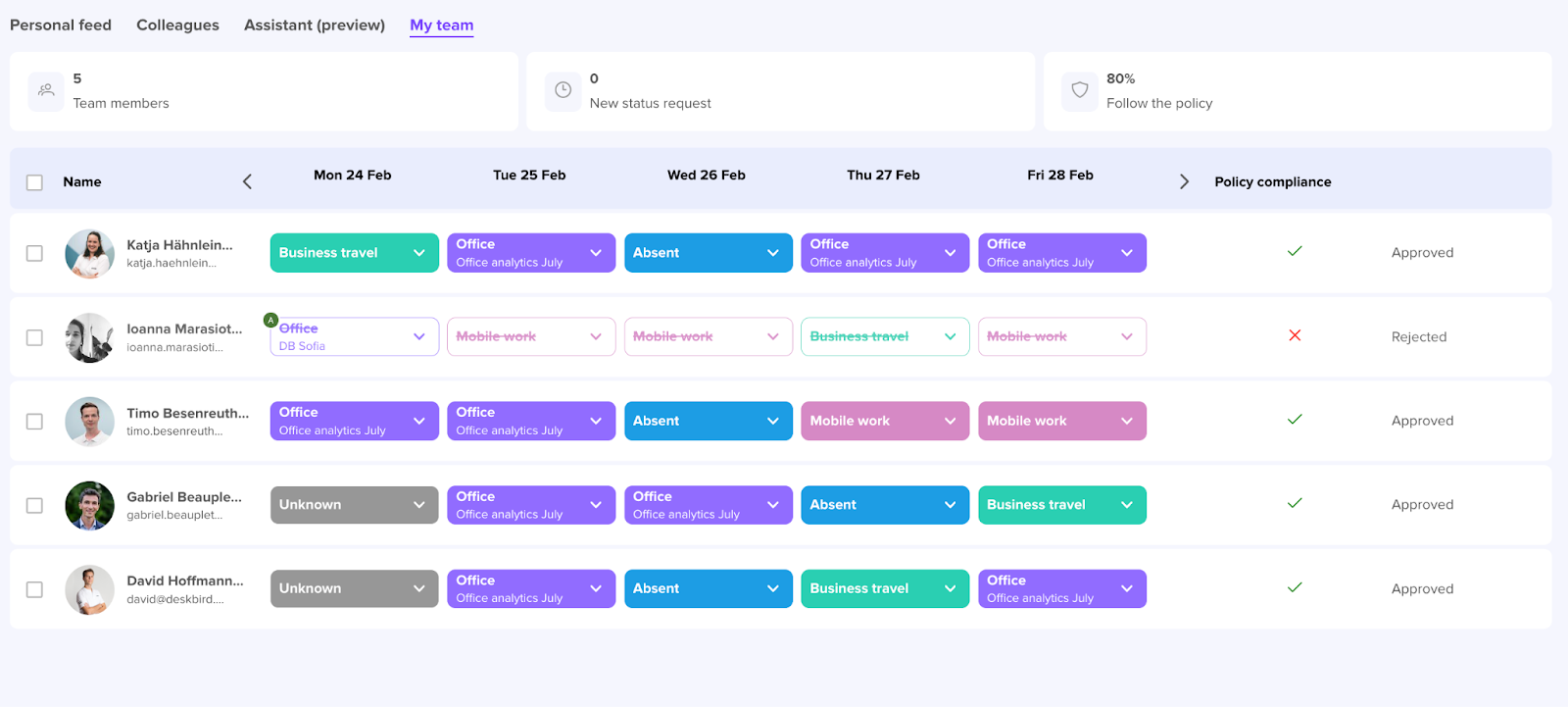 Los informes te ayudan a monitorear qué empleados están siguiendo las reglas y detectar tendencias en el trabajo remoto vs. en la oficina.