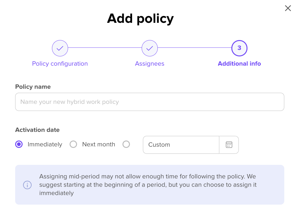 - Giorni in sede: Imposta i giorni minimi o richiesti in cui i dipendenti devono lavorare dall'ufficio.