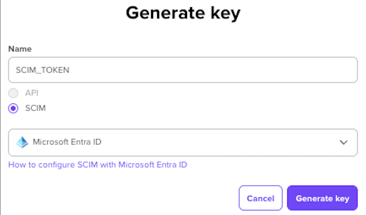 3. Scegli il tuo provider SCIM e genera il tuo token (c'è solo un token per azienda)