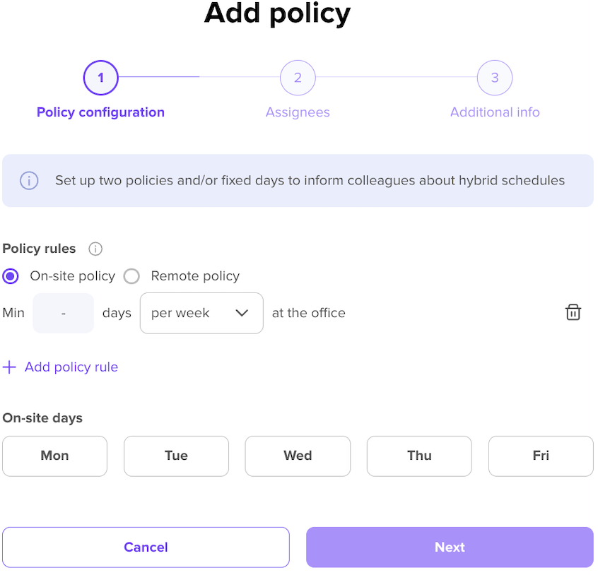 - Dagen op locatie: Stel minimum- of verplichte dagen in waarop werknemers op kantoor moeten werken.
